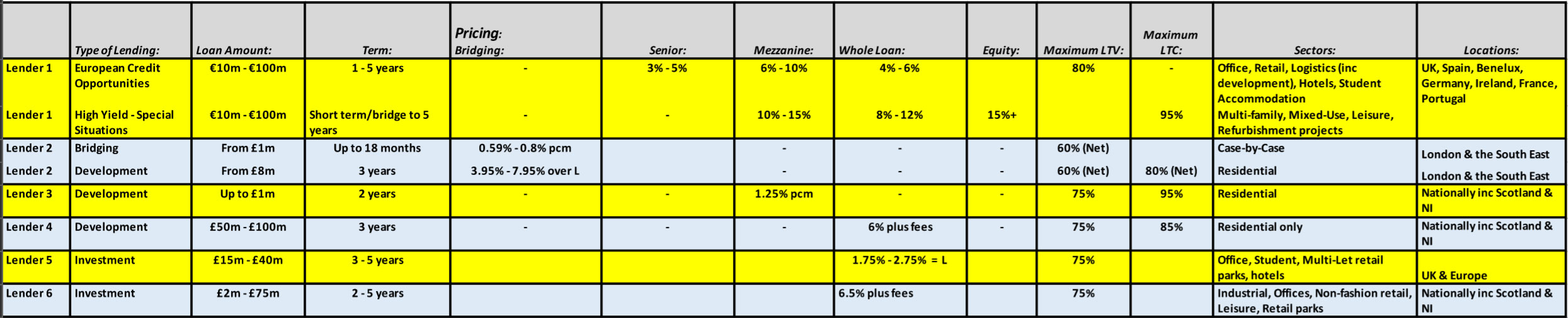 The facilities reviewed will cover bridging finance, senior debt, mezzanine debt, whole loans and equity where appropriate. From time to time we will also report on the availability of international funding.
