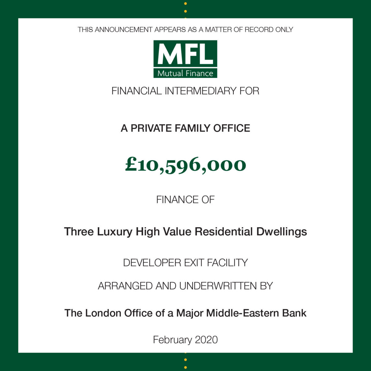Our client is a very experienced residential developer who was seeking a new relationship bank. We were able to introduce him to a Middle Eastern lender who quickly understood his requirements and successfully closed the deal at a very aggressive loan-to-cost ratio and highly attractive rates.