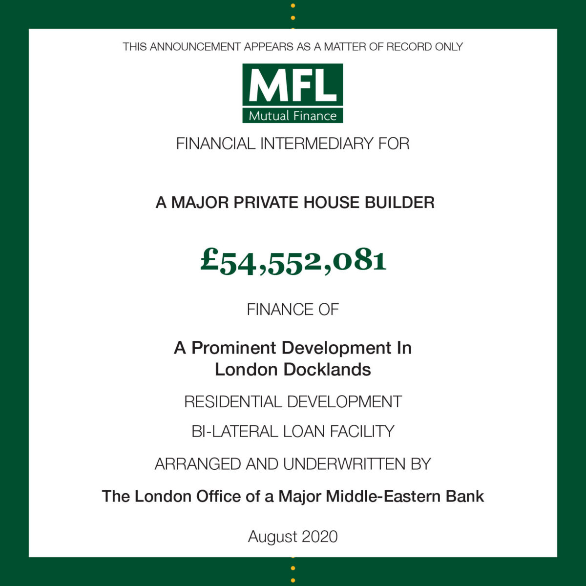Refinance of a development facility on a bilateral basis on very attractive terms for a major private house builder. This is essentially a “Bridge-To-Sell” structure that also allows unsold units to be let on Assured Shorthold Tenancy agreements – “AST’s”